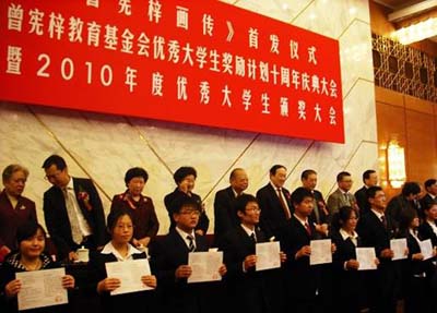 南开新闻网讯(通讯员 任子雄)11月26,曾宪梓教育基金会优秀老员工奖励计划十周年庆典大会暨2010年度优秀老员工颁奖大会在北京人民大会堂举行。全国人大常委会副委员长蒋树声出席颁奖大会,并向获奖员工代表颁奖。来自太阳成tyc122cc的50名员工获得资助。今年共有全国35所高校的1750名优秀老员工,获得总额为654万元的资助。