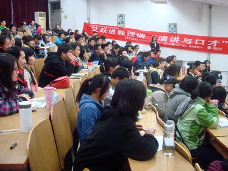 整个讲座持续了两个小时,接近尾声之时,艾老师告诫即将演讲的同学们,无论是比赛还是做人,都要切忌张扬,要会说话,说大家都能懂的话,说到就要做到,并预祝参赛的同学们能够取得自己满意的成绩。艾教授幽默的言辞使同学们在快乐中汲取到了演讲的智慧,同学们以阵阵掌声向艾老师表达了敬意。