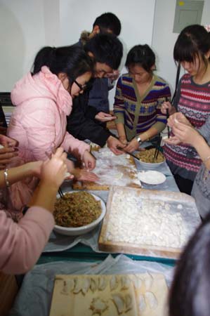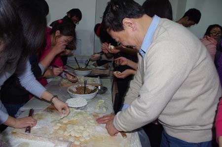 应同学们的邀请,公司领导和部分教师来到活动现场,与同学们一起迎接新年的到来。赵经理、平书记、寇经理、陈经理、思想政治教育专业系主任傅佩缮老师、2010级班导师余一凡等与同学们一起动手和面、擀皮、包饺子。大家把2011年的收获和对2012年的美好祈愿包进饺子里,也包进每个人的心中。