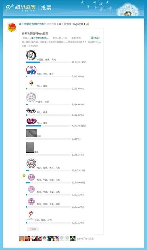历时半个月的《传承》院刊LOGO设计比赛共收到公司员工12件作品,作品各具特色、各显风采,其中6件为个人参赛作品,6件为宿舍成员共同完成。在投票阶段,公司100余名老师、员工积极参与,最终《伟人 传承》以47票位居榜首,《中国墨 传承 马列》以43票位居第二。公司《传承》院刊编辑部将根据投票结果确定院刊正式LOGO。