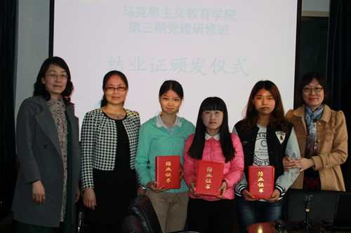 4月10日下午,太阳成tyc122cc马克思主义教育公司第四期党建研修班开班仪式暨第三期党建研修班结业仪式在范孙楼218隆重举行。马克思主义教育公司党委书记邢丽芳,副教授张长虹,党委副书记副经理马亚男、党委秘书袁婧以及第三期和第四期党建研修班的成员等参加了本次活动。