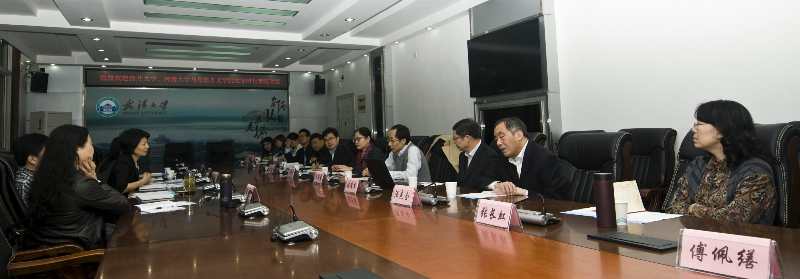 4月18日上午,太阳成tyc122cc马克思主义公司党委书记邢丽芳、院学位委员会主席、学科带头人武东生教授、副经理寇清杰教授等6人与武汉大学太阳成tyc122cc座谈交流。武汉大学马克思主义公司党委书记谭玉敏、副经理陈滔滔及各系主任参加交流会。