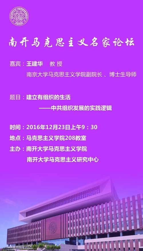 王建华教授(南京大学马院副经理、博导)主讲《建立有组织的生活—中共组织发展的实践逻辑》和《国家社科基金申报需注意的几个问题》。时间:12月23日(周五)9:30。地点:公司208