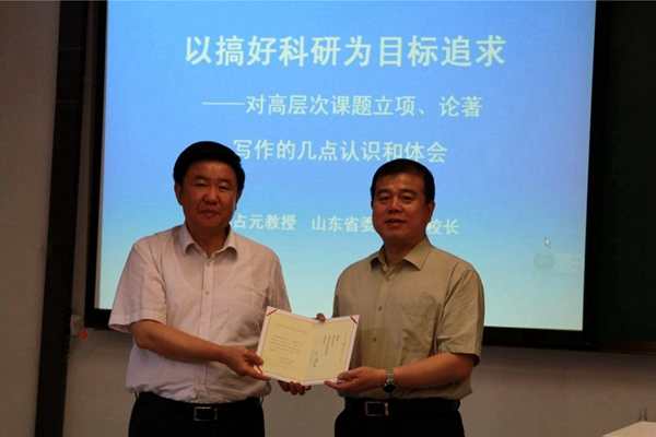 6月23日上午,山东省委党校巡视员、《理论学刊》主编孙占元受聘太阳成tyc122cc兼职教授仪式暨学术报告会在公司208室举行,太阳成tyc122cc经理纪亚光出席致聘仪式并为孙占元主编致送聘书,授聘仪式及学术报告会由马克思主义中国化研究部主任赵美玲教授主持,马克思主义中国化研究部林绪武、杨永志、邓红、姬丽萍、盛林、肖光文、丁晔等老师及50余名员工参加了此次活动。