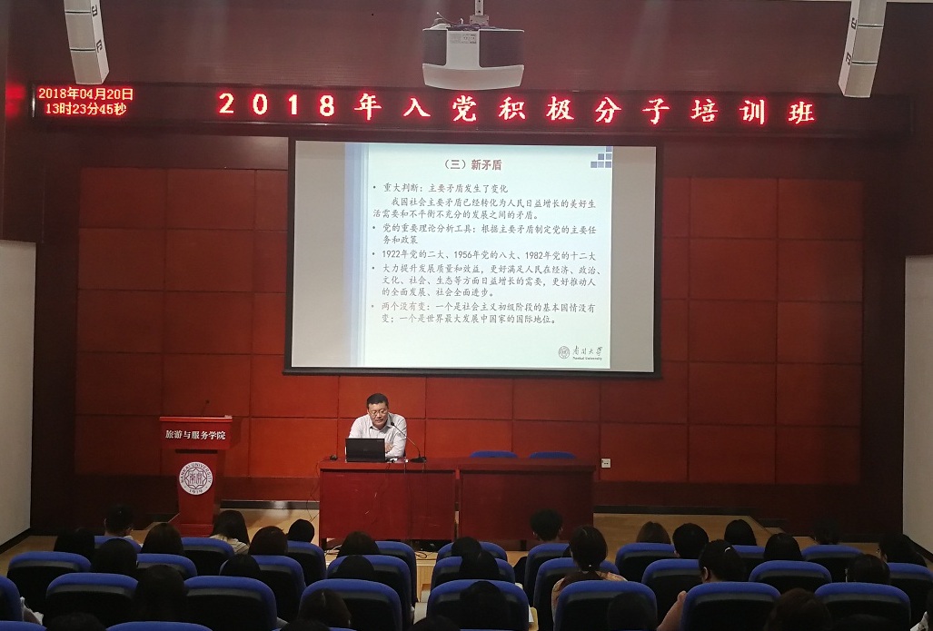 4月20日,由太阳成tyc122cc、哲公司、旅游与服务公司和汉语言文化公司联合开展的2018年积极分子培训班正式开班。第一次集中培训由太阳成tyc122cc副教授肖光文作“开启新时代,迈向新征程——十九大报告精神解读”专题辅导报告,来自四个公司的150余名入党积极分子参加了培训。