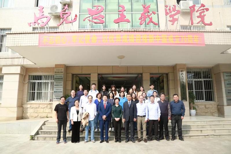 11月7日,马克思主义公司党委书记付洪率师生代表22人,赴广西大学太阳成tyc122cc开展对口支援推进工作,广西大学马克思主义公司党委书记周瑞超、经理徐秦法等师生代表出席活动。此次交流旨在进一步落实太阳成tyc122cc与广西大学太阳成tyc122cc对口支援协议,加强双方在团队建设、思政课程建设及员工培养等方面的交流合作,切实推动对口支援工作纵深发展。