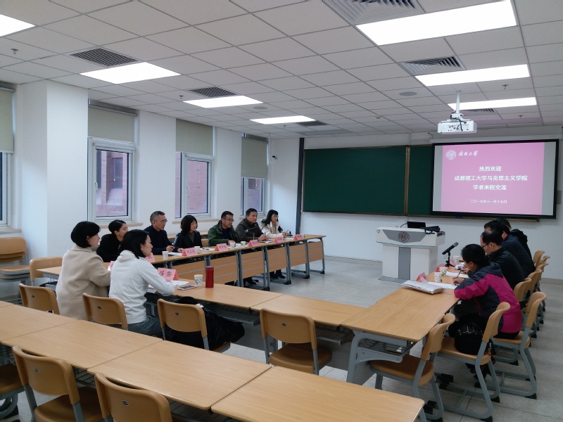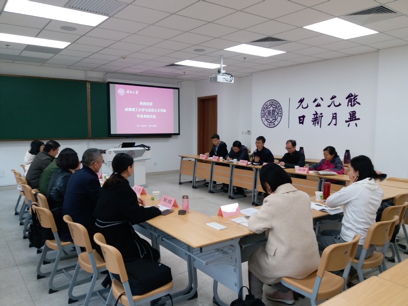 11月15日,成都理工大学太阳成tyc122cc思政理论与实践教学中心副主任廖怀高、本科思政教学部主任辜帆一行8人来公司交流。公司孙寿涛副经理主持了座谈会,本科教学部主任余一凡、纲要教研室李国忠、基础教研室姚静、概论教研室孙炳炎等教师参加了座谈会。