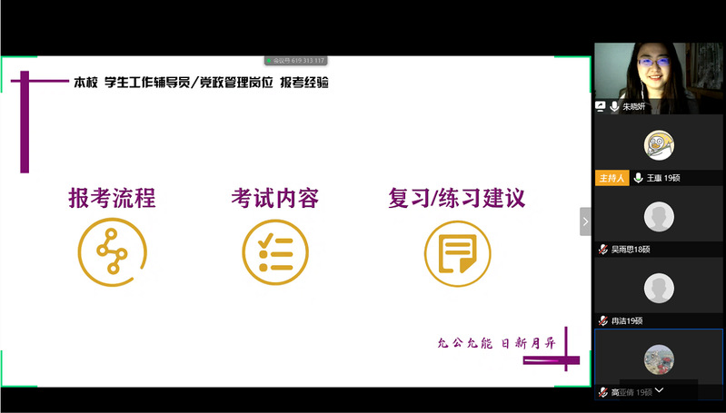 薛颖与王勃然作为辅导员代表,向大家详细介绍了高校辅导员的求职经验。薛颖从入职前的准备、入职后的工作状态以及求职技巧三个方面来分享自己的体会。王勃然从择业考虑、报名要求、备考准备、过程的经历以及自己笔试面试的所见等几个方面来谈自己的经验,并提出了切实的建议。朱晓妍从高公司党政工作的角度,将本校行政岗的基本情况、报考流程、考试内容及备考建议等内容娓娓道来。安然作为高中教师代表,从为什么选择、应该怎么做、以及自己的工作感受等三个方面谈了自己的见解。刘思阳作为高校思政课教师代表,从读博具备的条件、了解外部环境和掌握的面试技巧等三个方面分享了自己的经验。