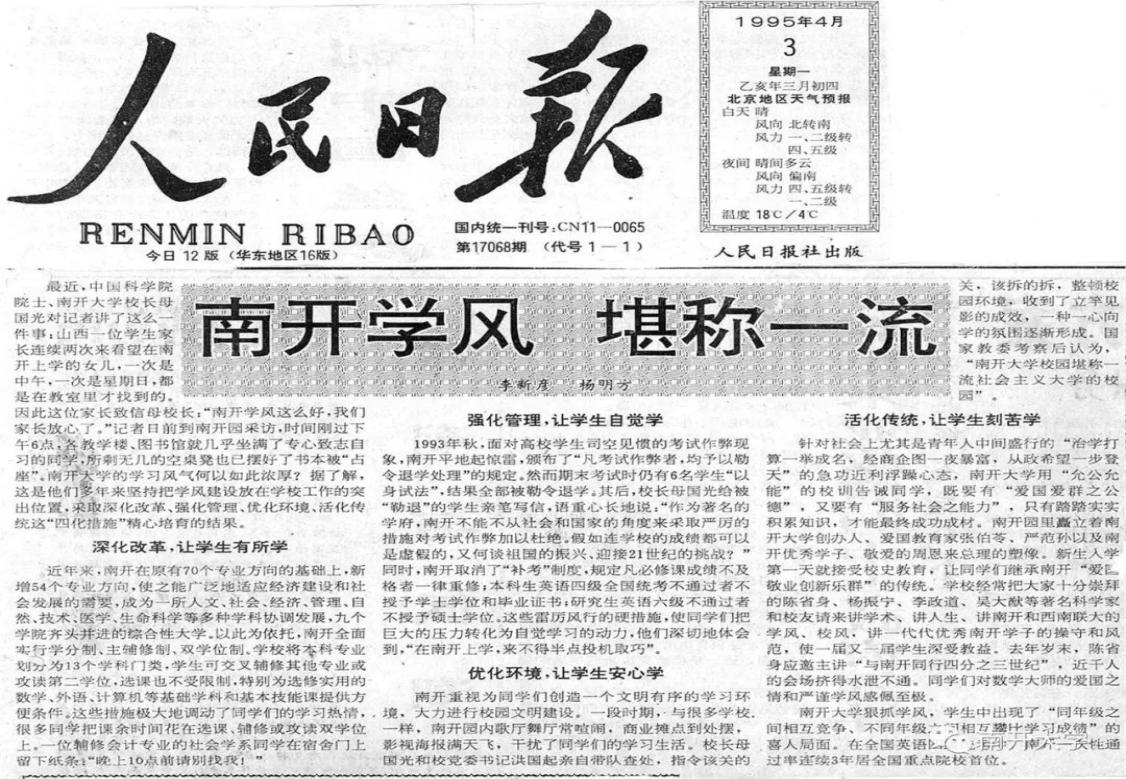 1995年4月3日,《人民日报》刊发了一篇《南开学风,堪称一流》的报道,在社会上引起很大的反响。