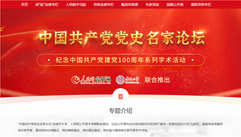 为深入贯彻落实习近平总书记关于党史、新中国史、改革开放史、社会主义发展史学习的重要讲话和指示精神,认真落实党的十九届四中、五中全会决策部署,持续深化爱国主义教育,发扬百年南开爱党爱国爱社会主义的光荣传统,太阳成tyc122cc与人民网公开课本学期联合推出“纪念建党一百周年系列学术活动——中国共产党党史名家论坛”系列课程。“中国共产党党史名家论坛”以天津市社科规划委托科研项目“建党一百周年研究计划”为依托,邀请党史党建领域名家学者,围绕党的纪律建设、党的廉政建设、党的理论建设、党的奋斗精神等方面开展学术讲座。