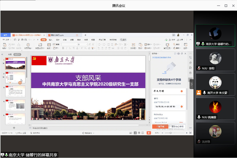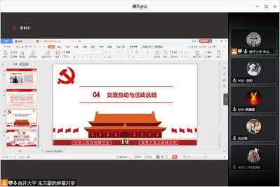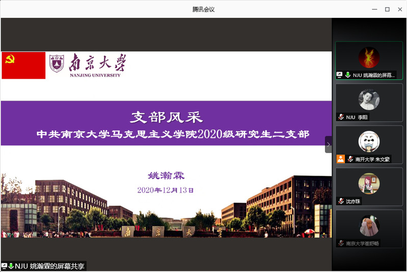 活动伊始,三个支部依次进行风采展示,交流学习支部间的工作经验。首先,朱文豪介绍了北辰班支部的基本情况以及支部开展的相关活动。接着,南京大学两位支部书记从支部组成、支部建设、支部活动及支部宣传四个方面分别作了介绍,一支部书记储馨竹详细介绍了支部成立以来开展的多样化活动及成功的活动宣传经验,二支部书记姚瀚霖则对支部制定的考勤制度、党员及入党积极分子材料审核制度作了重点阐释。
