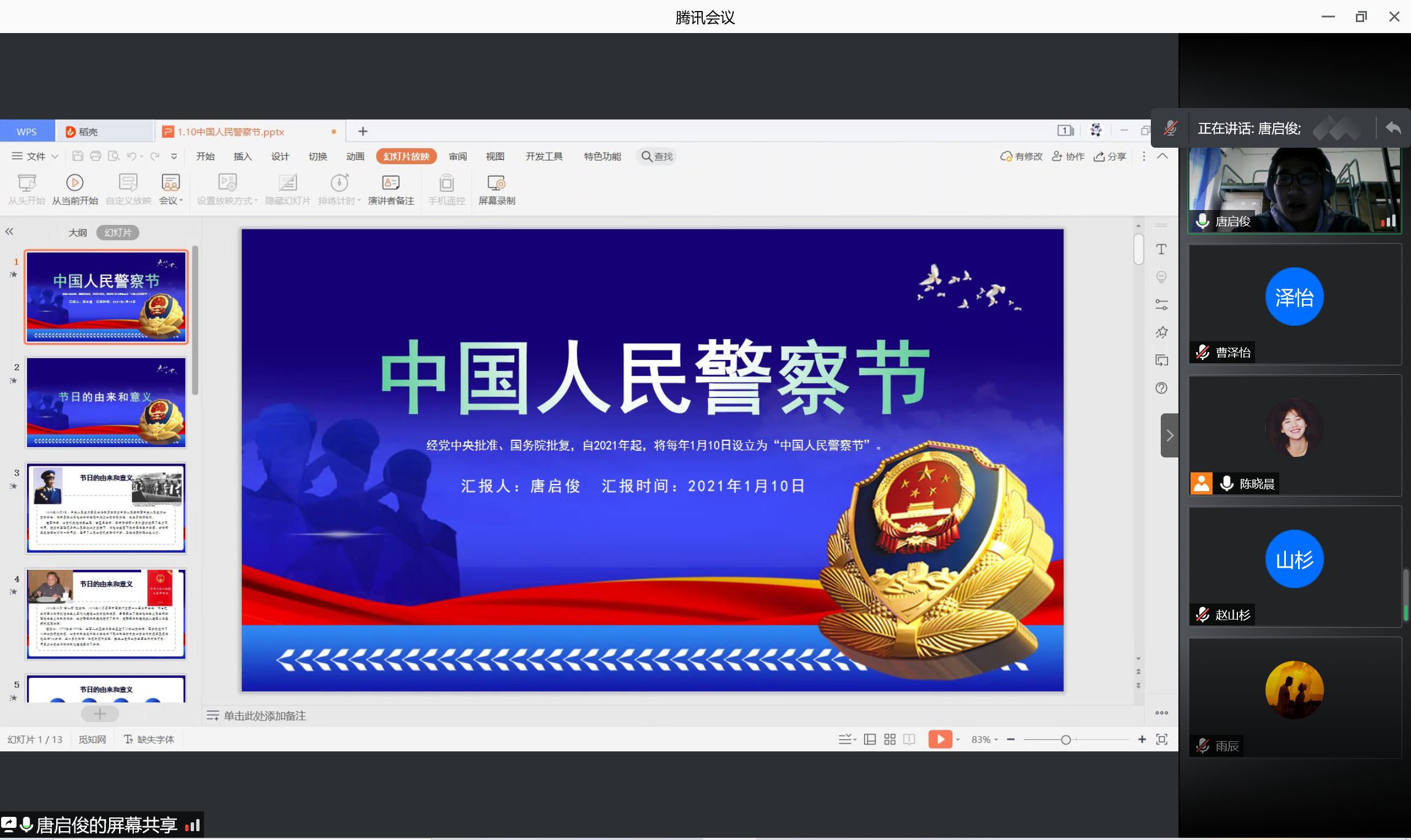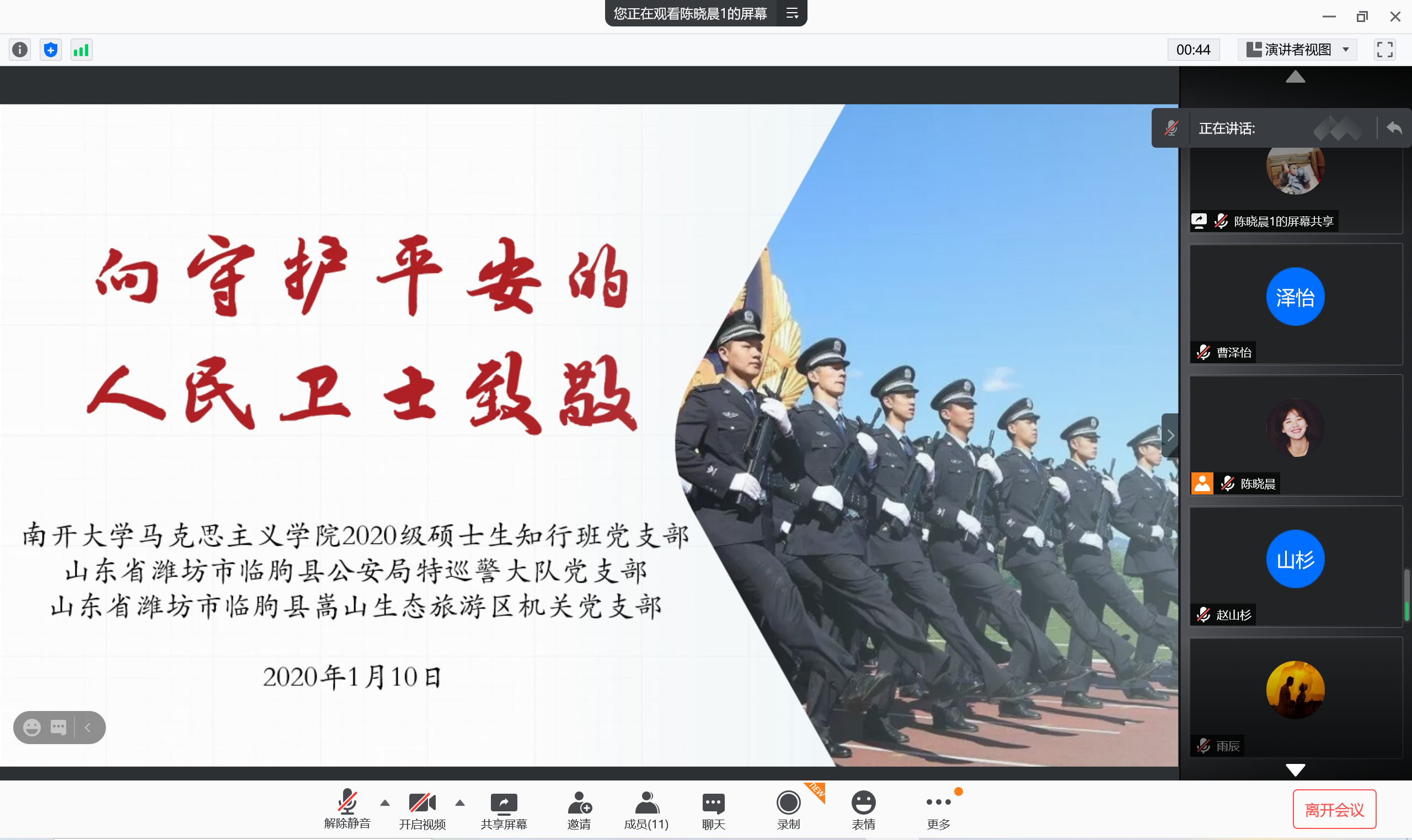 宣誓结束后,支部组织委员唐启俊从中国人民警察节的设立背景、节日意义和抗疫中的人民警察三方面对人民警察进行阐释。他提到,中国人民警察在中国特色社会主义事业的建设中发挥了不可替代的作用,是促进社会公平正义、保障人民安居乐业的守护者,他们以生命与热血守护人民,用责任和担当捍卫使命。