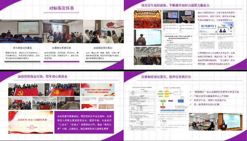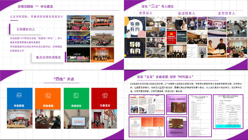 党团班一体化建设。已实现全部16个研究生班级“党团班一体化”建设,公司团委副书记担任本科党支部书记。不断提升党团班的有效协调,统筹安排。