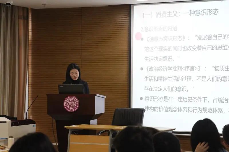 2019级本科生陈丹亭同学作了题为“马克思主义视阀下消费主义的意识形态研究”的发言。首先,陈丹亭同学分析了消费主义的内生逻辑,以消费主义是一种意识形态入手,通过对消费主义、意识形态的定义的探讨,结合消费是实现资本主义社会再生产的重要环节和消费主义的资本主义意识形态本质体现在其维护资本主义制度的现实,作出了“消费主义是一种资本主义意识形态”的论断。其次,又探讨了消费主义意识形态产生的历史背景,即20世纪60年代社会生产模式发生了从福特主义到后福特主义的转向,资本主义社会也发生了从生产社会向消费社会的转型,以“消费为主导”的生产模式的出现客观上要求刺激人们消费,消费主义意识形态具有产生的需要。于此同时,宗教和早期古典经济学理论等传统意识形态客观上阻碍了消费的扩大,改革传统意识形态的需要也客观上推动了消费主义的产生。接着,又分析了消费主义意识形态的运作机制,第一点是对于人性的利用,即消费是满足需要的一种方式,法兰克福学派也从“虚假需要”与“异化消费”的角度对此进行了研究与批判;第二点是符号逻辑,运用了鲍德里亚的学说来论证资本通过操纵符号生产,利用符号逻辑控制消费,实现了对于大众的意识形态操纵,个体被整个符号系统所异化;第三点是大众传媒,通过对大众传媒的意识形态潜能和广告是大众传媒的消费主义意识形态的实现论证了大众传播媒介体系对于消费主义意识形态深入到人们的日常生活领域发挥了重要作用。最后,陈丹亭同学对该发言进行了总结。