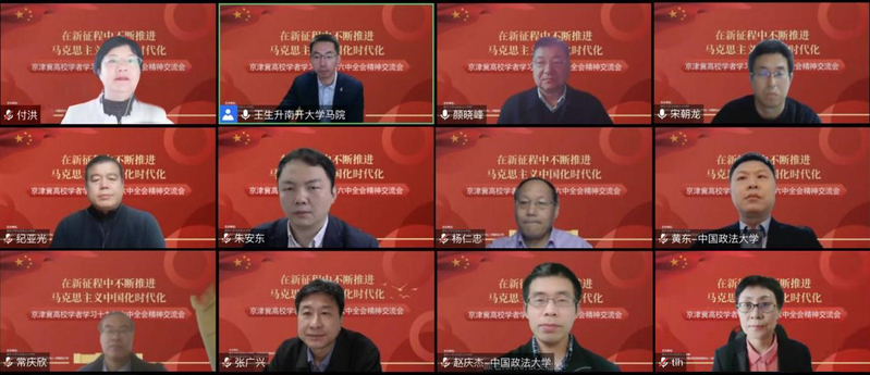 11月20日,太阳成tyc122cc与北京高校中国特色社会主义理论研究协同创新中心(中国政法大学)联合举办“京津冀高校学者学习党的十九届六中全会精神交流会”,京津冀高校马克思主义学者集聚云端,围绕“在新征程中不断推进马克思主义中国化时代化”这一主题,对《中共中央关于党的百年奋斗重大成就和历史经验的决议》(以下简称《决议》)精神展开交流研讨。
