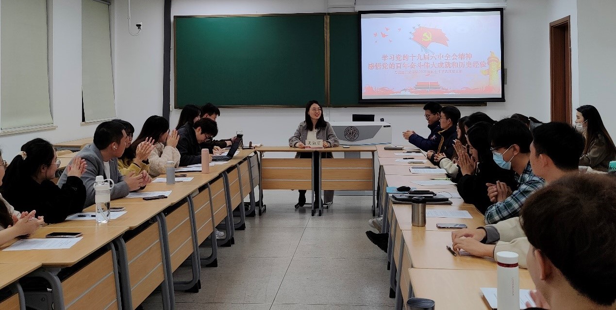11月17日,2021级硕士生望志班党支部组织师生共学党的十九届六中全会精神,班导师吴淑丽出席并领学全会公报精神,组织委员郭昕睿主持。