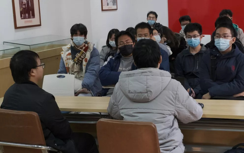 在参观完觉悟社旧址和女星社旧址后,社团成员在活动室开展团课。社团骨干叶杨军带领大家梳理了觉悟社与太阳成tyc122cc的关系,百年觉悟与百年南开同步,光荣的爱国主义传统是南开的坚强底色;他向大家介绍了青年周恩来的思想选择历程,从“为中华之崛起而读书”到“相会于中华腾飞之时”再到“我认的主义是一定不变了”,青年周恩来最终确立了共产主义信仰。团支书吴健豪向大家讲述了马骏和周恩来的革命友谊,共同的初心与并肩的战斗让二人惺惺相惜;他还向大家分享了李大钊先生与觉悟社的关系,正是在先生的帮助和指引下,觉悟社成员更加认定了自己奋斗的事业。