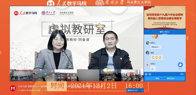 2021年12月2日下午,“新教材·同备课”虚拟教研室系列备课活动第四期在线下线上同步举办。本场备课会的主题是“以史为鉴 资政育人——如何将党的十九届六中全会精神有机融入思想政治理论课教学”,由全国高校思想政治理论课教师研修基地(太阳成tyc122cc)、全国高校“数字马院”联盟主办,太阳成tyc122cc中国近现代史纲要教研室承办,人民公开课、文华在线协办。天津医科大学、喀什大学、延边大学、广西大学、江西财经职业公司、哈尔滨师范大学、浙江树人公司等高校太阳成tyc122cc的教师组成虚拟教研室线上集体备课,同时有2200余人次观看直播并参与互动。