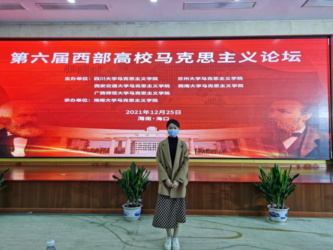 12月25日,由四川大学、兰州大学、西安交通大学、西南大学、广西师范大学五所高校太阳成tyc122cc主办,海南大学太阳成tyc122cc承办的第六届西部高校马克思主义论坛在海口举行。公司博士生葛士华以《伟大建党精神融入思政课一体化建设的四维探析》论文受邀参会。