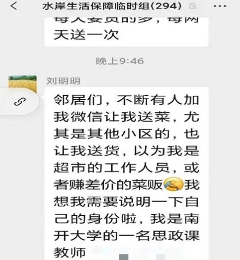 最近不少社区居民在微信微博上表扬他、感谢他,对此,刘明明自己调侃,之前作为一名老师,除了教书科研写论文,不知道自己还能干什么,这次知道自己还能“卖菜”。而作为一名思政课教师,经常在课堂上讲集体主义、讲核心价值观,这次算是一次应该做的实践吧。