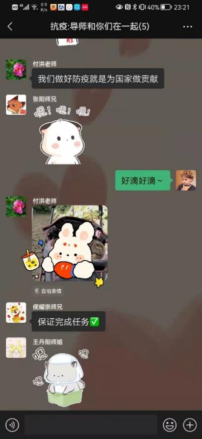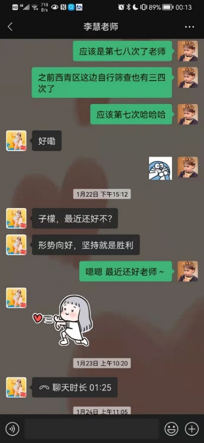 110日,社区全员阴性的核酸结果让一颗颗惴惴不安的心稍加平静,由于居住条件不便,我搬离到西青区一家酒店暂住。入住的第一晚,我久久难以入眠,无数问题伴随着消极情绪在我脑中闪过,伴着忧虑与孤单涌上心头,思乡之情也泛上眉梢。第二天我主动联系了辅导员李慧老师,李老师将疫情防控的注意事项一一嘱托,并耐心安抚我的情绪,“我的手机24小时都开机,有什么事情随时联系我”是她的真诚付出;导师付洪老师的在线陪伴更是驱逐了我漫漫长夜里的孤独,让我有了坚持下去的信心与勇气。《抗疫:导师和你们在一起》的微信群记录了付老师和我们共同坚守的全过程,承载了她对我们的深切关爱;一篇名为《孩子别怕,导师有话和你说》的深夜寄语驱散了孤独心灵的阴霾。其中,付老师说的三句话我一直铭记在心:一是坚定必胜信心;二是安排好特殊时期的学习和生活;三是在与疫情的战斗中锻炼成长。从彷徨到坚定,这三句话成为公司准自身成长进步的“定盘星”,也是我在这场战“疫”中突破自我的第一步。