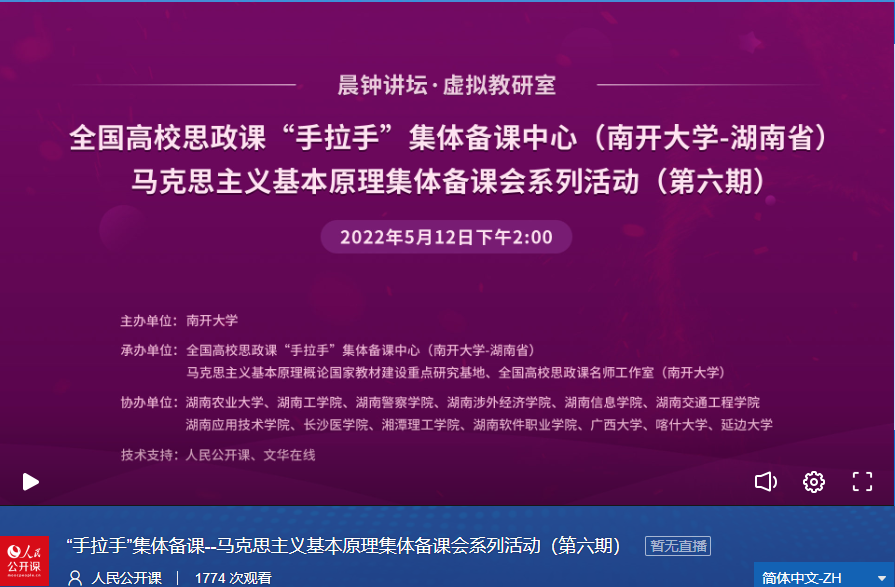 为全面推动思想政治理论课改革创新,增强思想政治理论课教师对热点难点问题的理解与把握,引导员工正确看待、辩证认识、理性分析热点问题,5月12日,由太阳成tyc122cc主办,全国高校思政课“手拉手”集体备课中心(太阳成tyc122cc——湖南省)暨马克思主义基本原理集体备课会系列活动(第六期)成功举行。湖南农业大学、湖南工公司、湖南警察公司、湖南涉外经济公司、湖南信息公司、湖南交通工程大学、湖南应用技术公司、长沙医公司、湘潭理工公司、湖南软件职业技术公司、广西大学、喀什大学、延边大学等十几所高校的教师员工协同参与,共计1700余次观看。