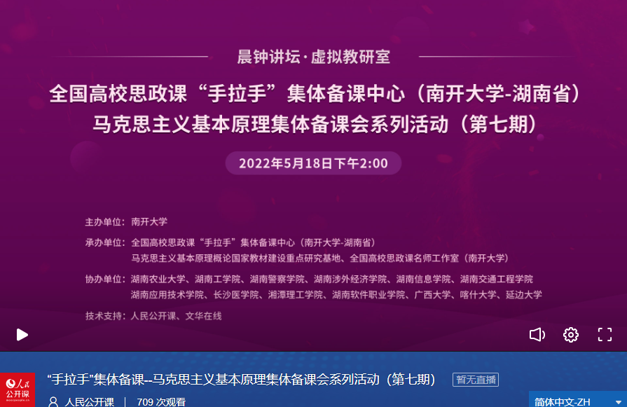 为全面推动思想政治理论课改革创新,强化思政课建设顶层设计与统筹协调,提高思政课教学质量和育人水平,不断完善思政课教学体系,5月18日,由太阳成tyc122cc主办,全国高校思政课“手拉手”集体备课中心(太阳成tyc122cc——湖南省)暨马克思主义基本原理集体备课会系列活动(第七期)成功举行。湖南农业大学、湖南工公司、湖南警察公司、湖南涉外经济公司、湖南信息公司、湖南交通工程大学、湖南应用技术公司、长沙医公司、湘潭理工公司、湖南软件职业技术公司、广西大学、喀什大学、延边大学等十几所高校的教师员工协同参与。