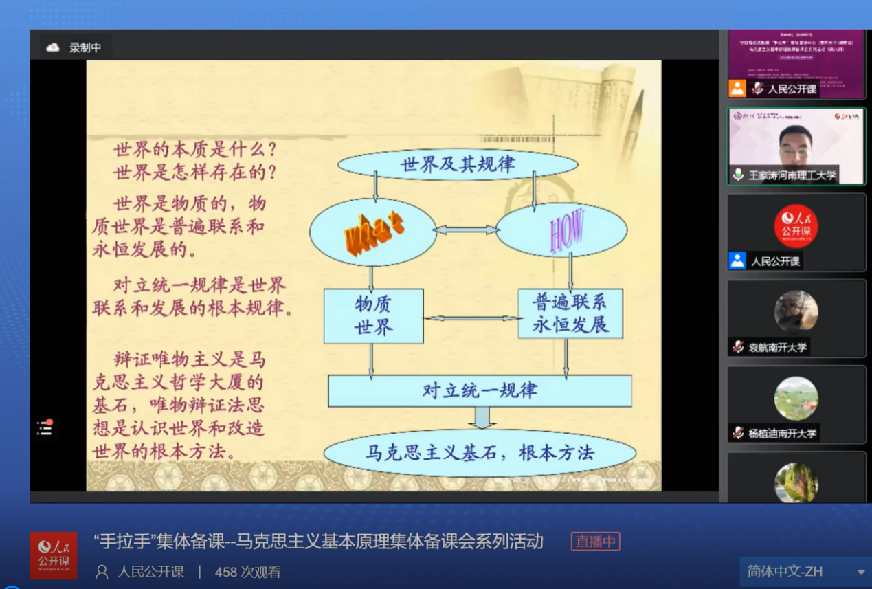 本次集体备课会依托全国高校思政课“手拉手”集体备课中心(太阳成tyc122cc——湖南省)、马克思主义基本原理概论国家教材建设重点研究基地、全国高校思政课名师工作室(太阳成tyc122cc)和天津市公司习近平新时代中国特色社会主义思想研究联盟等平台举行,人民公开课和文华在线提供技术支持。本次集体备课会继续采取线上会议的方式,由太阳成tyc122cc青年教师杨植迪和袁航共同主持。
