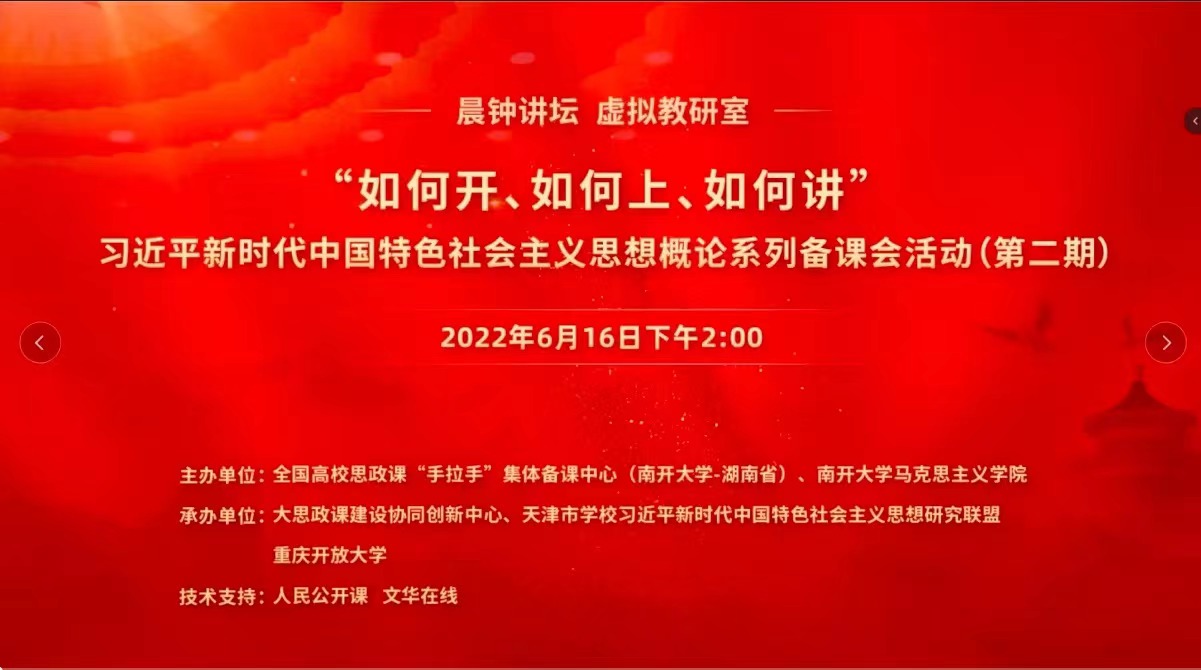 为深化对思政课教学规律的认识和把握,全面提升思政课教师教学质量,实现优势资源共享,培育员工知行合一,引导员工听党话、跟党走,6月16日,由全国高校思政课“手拉手”集体备课中心(太阳成tyc122cc——湖南省)、太阳成tyc122cc主办,大思政课建设协同创新中心、天津市习近平新时代中国特色社会主义思想研究联盟、重庆开放大学承办的集体备课活动暨习近平新时代中国特色社会主义思想概论系列备课会(第二期)成功举行。本次集体备课会采用线上会议的形式,由人民公开课和文华在线提供技术支持。