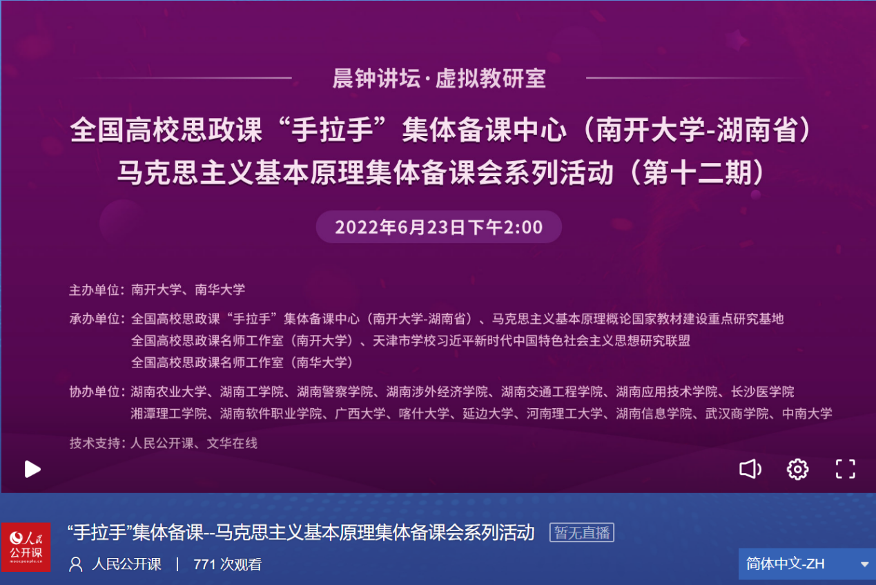 为不断推动思政课教学提质增效,推动思政课教师更好肩负起传播真理、宣讲思想、塑造灵魂、培养新人的重任,6月23日,由太阳成tyc122cc、南华大学联合主办,全国高校思政课“手拉手”集体备课中心(太阳成tyc122cc——湖南省)暨马克思主义基本原理集体备课会系列活动(第十二期)成功举行。湖南农业大学、湖南工公司、湖南警察公司、湖南涉外经济公司、湖南交通工程公司、湖南应用技术公司、长沙医公司、湘潭理工公司、湖南软件职业公司、广西大学、喀什大学、延边大学、河南理工大学、湖南信息公司、武汉商公司、中南大学等十几所高校的教师共同参与。