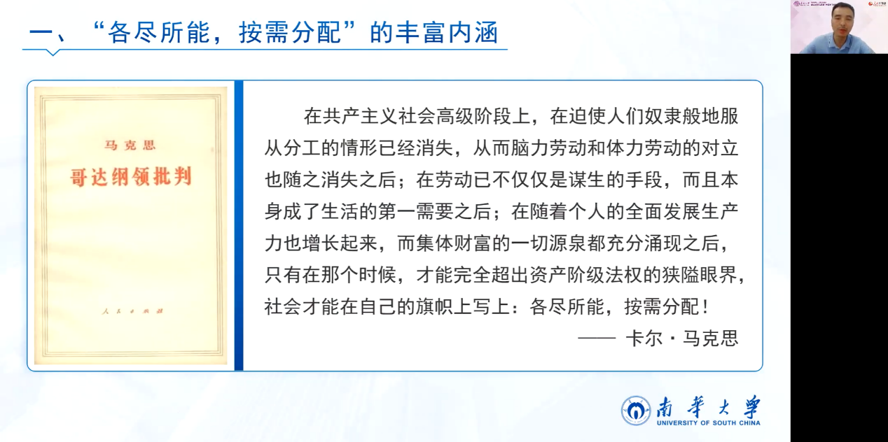 接着,集体备课会邀请南华大学邹平林老师做了题为“共产主义的原则——各尽所能、按需分配”的教学展示,对应教材第七章第一节“展望未来共产主义新社会”。邹老师提到,在实际教学当中,很多老师对这一章节的讲解较为简略,很难有效解答员工关于共产主义理想社会及其是否可能实现等方面的困惑。他认为“各尽所能、按需分配”是共产主义的核心原则和鲜明特征,对这一原则的丰富内涵、重大意义和理论可能进行深入阐释,有助于员工更深层次地理解和掌握这一知识点。他强调指出,这部分内容具有较强的理论性和思辨性。