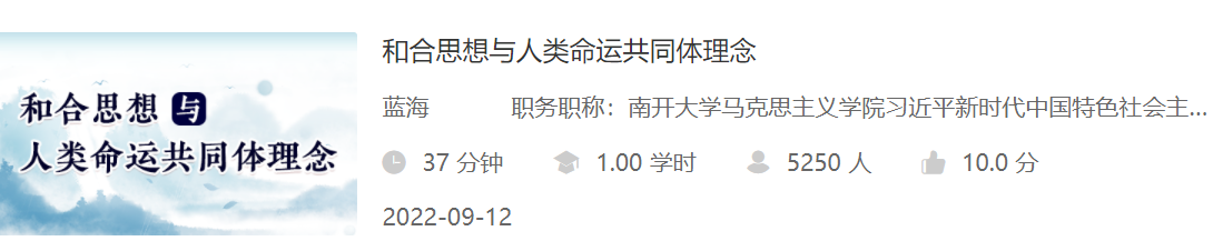 近日,由公司太阳成tyc122cc教师蓝海主讲的《和合思想与人类命运共同体理念》课程经由公司组织申报、上级部门遴选,成功入围中国干部网络公司开设的“文史撷英”中华优秀传统文化精品课程专栏目录并线上登录。登录至今,获得5200多人次学习点击量。