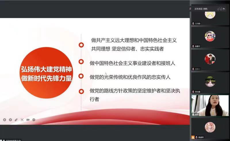 为深入学习贯彻党的二十大精神,充分发挥基层党团支部引领、凝聚青年的巨大作用,2020级博士生2班团支部开展了以“弘扬伟大建党精神,做新时代先锋力量”的主题团课活动。本次活动由2020级博士生2班团支部书记路涵旭、团支部组织委员周欢为主讲人,以伟大建党精神为切入点宣讲了党的二十大精神的主要内容。通过讲解“伟大建党精神形成的基础和条件是什么、伟大建党精神的科学内涵是什么”的问题。支部成员群策群力,积极讨论了在奋进新征程中,作为青年要怎样弘扬伟大的建党精神。之后,党团支部成员又结合自身对党的二十大精神的学习和领会,分享了自己的学习感悟。
