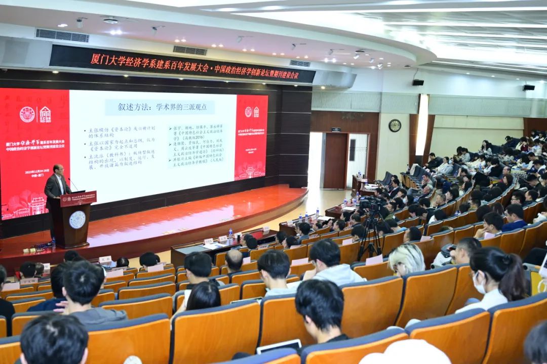 为更好推动马克思主义中国化时代化、中国特色社会主义政治经济学研究,促进马克思主义基本原理与中国具体实际相结合、同中华优秀传统文化相结合,增强学者与学术期刊的对话交流,由厦门大学经济公司、王亚南经济研究院、邹至庄经济研究院和中国政治经济学年会联合主办,厦门大学经济公司经济学系承办的“中国政治经济学创新论坛暨期刊建设会议”于20231125-26日在厦大经济楼成功举办。该论坛是厦门大学经济公司经济学系建系百年大会重要活动之一,含开幕、闭幕主题演讲和分论坛环节,10位来自政治经济学领域的专家带来主题演讲,22篇研究成果在分论坛中被报告分享和研讨。公司博士生胡泽鹏受邀参加会议,并在分论坛上进行主题发言。
