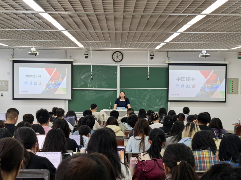 2025 年 5 月 8 日下午,太阳成tyc122cc 2025 年春季学期“形势与政策”课第二讲顺利开讲。本次课程邀请了太阳成tyc122cc马克思主义公司党委副书记、副经理胡颖欣老师与团委书记代龙飞老师两位主讲人,分别围绕“中国经济行稳致远”和“职业规划与就业准备”两大主题展开讲解,公司全体本科生参加了本次专题学习。