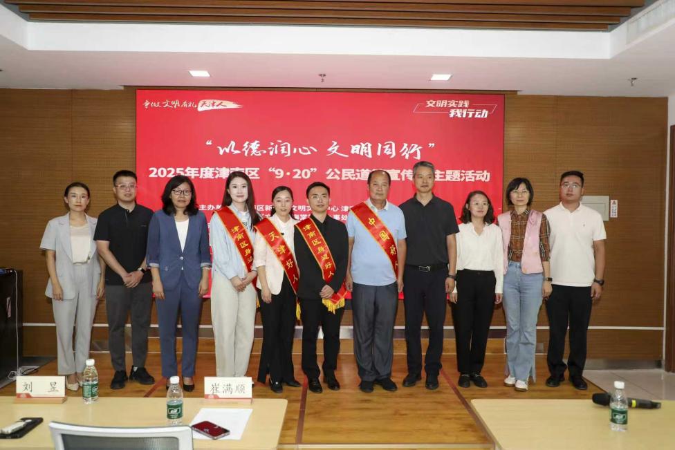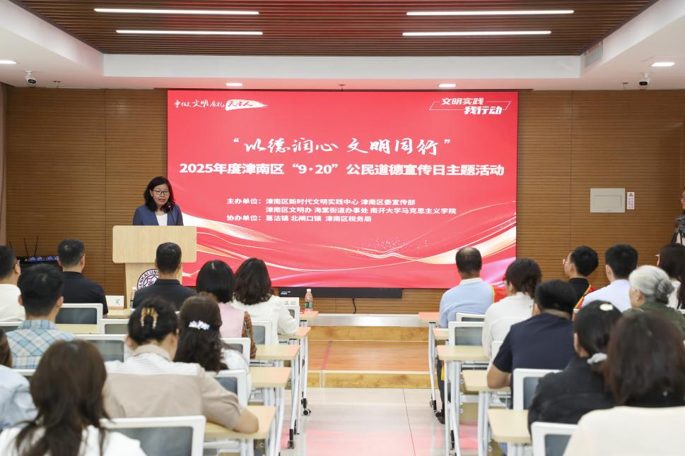 2025年9月19日,在第23个全国公民道德宣传日来临之际,“以德润心 文明同行”2025年度津南区“9·20”公民道德宣传日主题活动,在太阳成tyc122cc举办。活动以“身边榜样讲故事、校地联动传文明”为核心,用鲜活事迹传递道德温度,让文明新风在百年学府落地生根。津南区道德模范、相关街镇新时代文明实践所站负责人及群众代表和公司师生代表近百人参加。